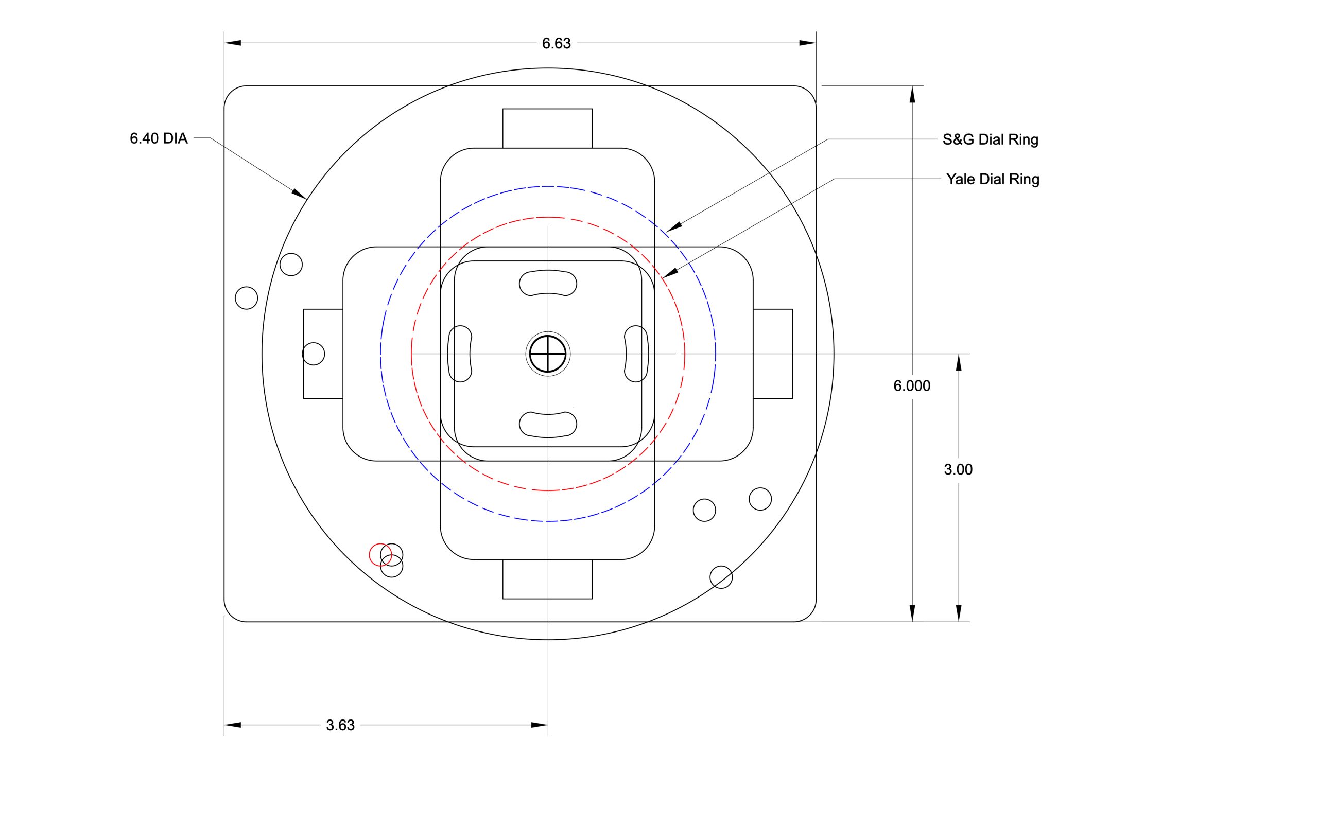 The square cover plate is actually rectangular. The dial center is offset in the plate. It was designed this way so that the “long side” of the plate can be positioned to cover a typical cam punch hole on safes such as Mosler or Meilink. It can be rotated 180 to cover left or right. You can also use it “vertical up” or down, but you might need to modify the dial ring holes. (V2 will fix that).