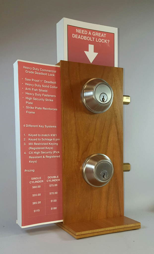 This one is shown with an optional, user supplied, signage. The unique design of this mount allows you to use your word processor ato create your own sales message using stiff paper. It can be folded to fit in the top, or captured between the parts of the mount. Easy Peasy! See the “Sales Techniques” page for the templates.