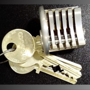 A collectable Medeco cutaway cylinder salesmans sample, original, pre-biaxial. Includes 2 original keys with the same depth of cut. On one key, cuts 2 and 5 have the wrong angle so you can observe how the pin doesnt rotate. 2 extra duplicates also included.